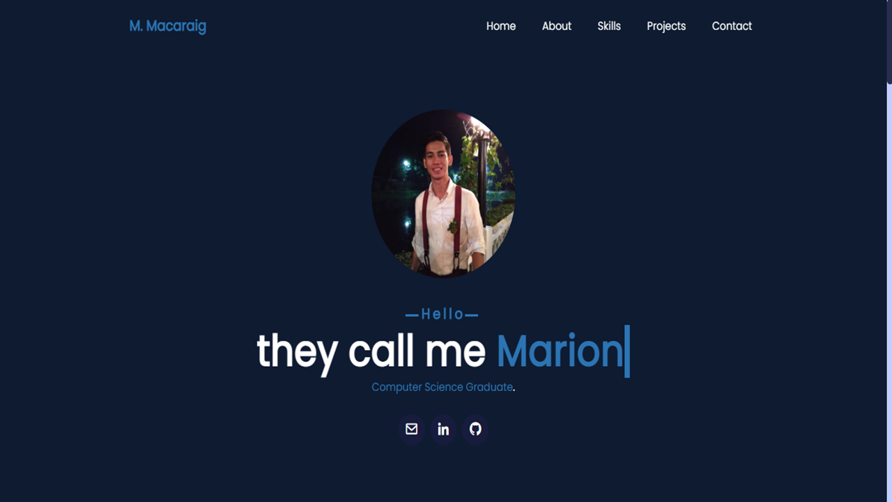 My name is Marion Christian Macaraig and I am computer science graduate. I love Web Development. I really like the idea of building 'pretty things' on the web. I'm using my free time to learn more and more, please check my github repository to see my other project and also please leave a message down below and I will get back to you as soon as possible.